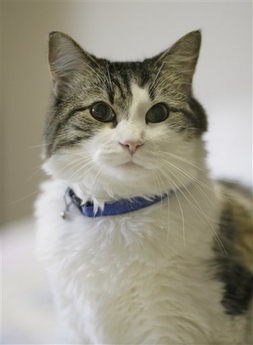 Oscar, a hospice cat at the Steere House Nursing and Rehabilitation Center in Providence, R.I., sits outside a patient's room, Monday, July 23, 2007. |